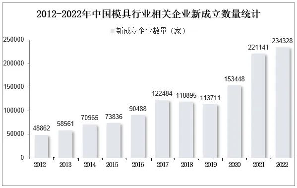 2022年全球模具行業規模超過2.1萬億元人民幣,中國模具行業市場規模超過3200億元人民幣。從行業競爭格局來看,模具行業屬于大行業,2012年-2022年,國內模具行業相關企業新成立數量由48862家增長到234328家。【本文數據、圖表來源:華經產業研究院、鳳凰網】