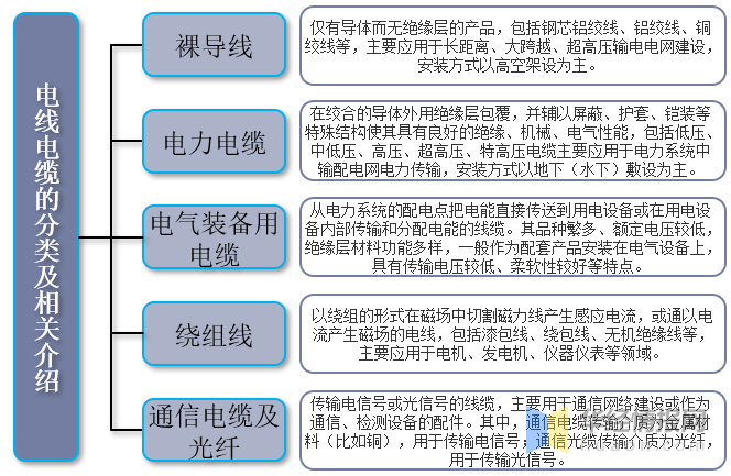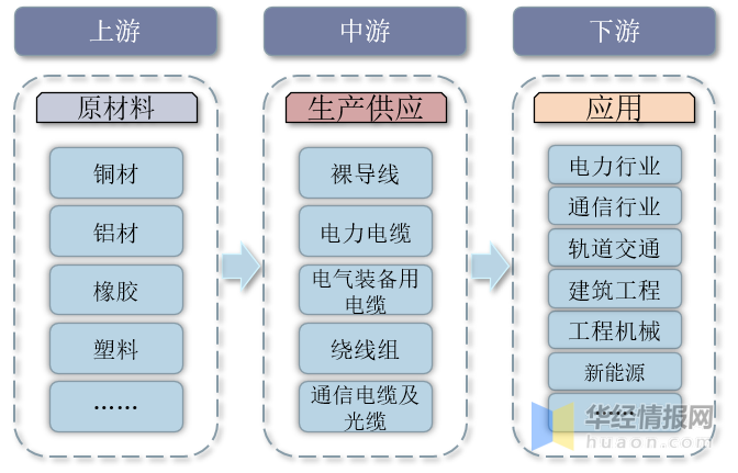 電線電纜行業(yè)產(chǎn)業(yè)鏈上游主要為銅材、鋁材、橡膠、塑料等原材料;中游為電線電纜生產(chǎn)供應(yīng)環(huán)節(jié),主要產(chǎn)品包括裸導線、電力電纜、電氣裝備用電纜、繞線組、通信電纜及光纖;下游廣泛應(yīng)用于電力、通信、軌道交通、建筑工程、工程機械、新能源等領(lǐng)域。