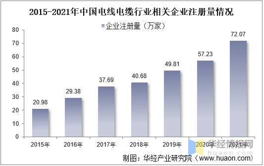 隨著我國電線電纜行業(yè)的快速發(fā)展,行業(yè)新增企業(yè)數(shù)量不斷增長。據(jù)資料顯示,截至2021年底,我國電線電纜行業(yè)相關(guān)企業(yè)注冊量達72.07萬家,同比增長25.9%。
