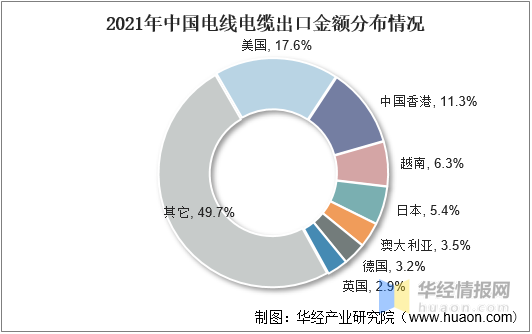 從出口分布情況來看,2021年我國電線電纜出口金額中,占比前三的地區(qū)分別為美國、中國香港及越南,占比分別為17.6%、11.3%和6.3%。