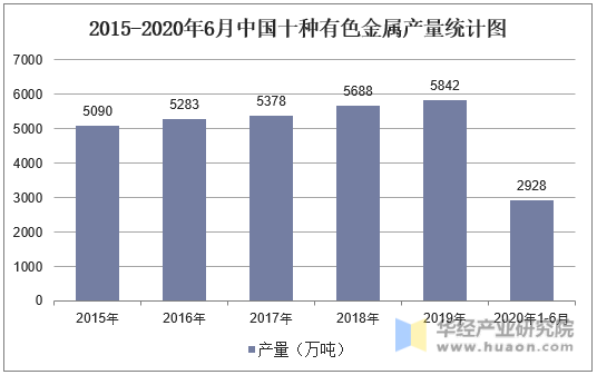 2015-2020年6月中國十種有色金屬產量統計圖