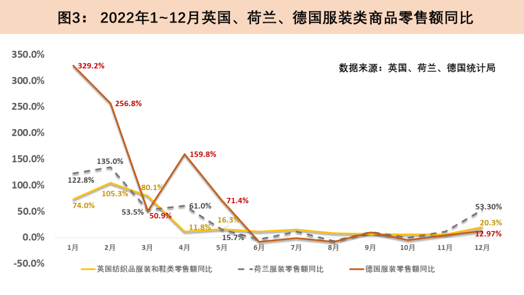 英、德、荷三國2022年上半年服裝類商品零售同比呈現(xiàn)大起大落態(tài)勢,主要與2021年各國防疫政策的不斷調(diào)整對相關(guān)產(chǎn)品消費(fèi)的影響有較大關(guān)聯(lián)。整體上看,上述三國2022年服裝類商品零售均得到了明顯恢復(fù)和發(fā)展。