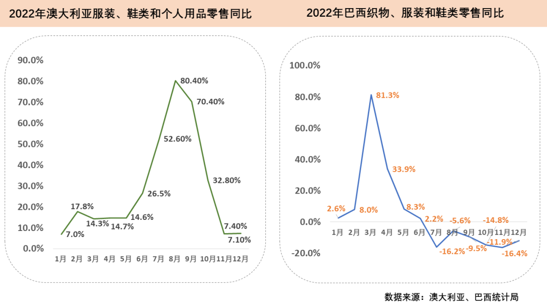 2022年澳大利亞CPI全年上漲7.8%,創(chuàng)1990年以來最大年度漲幅。同年,澳大利亞服裝類商品零售額整體表現(xiàn)相對平穩(wěn),7至9月在上一年低基數(shù)效應(yīng)的影響下實(shí)現(xiàn)兩位數(shù)的大幅增長。2022年全年澳大利亞服裝、鞋類和個人用品零售額達(dá)347.2億澳元(約232.2億美元),同比增長25.4%。