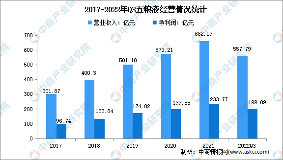 五糧液主要產品“五糧液酒”是我國濃香型白酒的典型代表。同時,五糧液根據生產工藝特點開發了五糧春、五糧醇、五糧特曲、尖莊等品類齊全、層次清晰的系列酒產品。2021年,五糧液營業收入達662.09億元,凈利潤實現233.77億元。2022年前三季度實現營業收入557.79億元,凈利潤199.89億元。