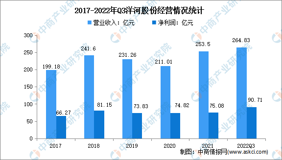 洋河股份是全國大型白酒生產企業,是白酒行業唯一擁有洋河、雙溝兩大中國名酒,兩個中華老字號,六枚中國馳名商標的企業。洋河股份主導產品夢之藍、天之藍、海之藍、蘇酒、珍寶坊、洋河大曲、雙溝大曲等系列白酒,在全國享有較高的品牌知名度和美譽度。2021年,洋河股份營業收入達253.5億元,凈利潤達75.08億元。2022年前三季度,洋河股份實現營業收入264.83億元,凈利潤達90.71億元。